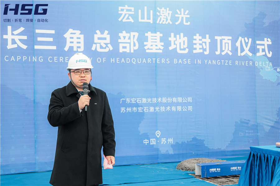 在聽取基地建設進度匯報后,宏山激光董事俞宏標先生為此次活動發表致辭,俞總對多方施工單位表達了感謝,并表示:長三角總部基地的建設,是宏山激光國內乃至全球布局發展的重要一環,是宏山激光增資擴產、擴大企業實力、完善戰略布局的重要步驟。未來,長三角總部基地將扎根蘇州,面向華東、華北地區,為用戶提供“家門口”的激光智能裝備服務。